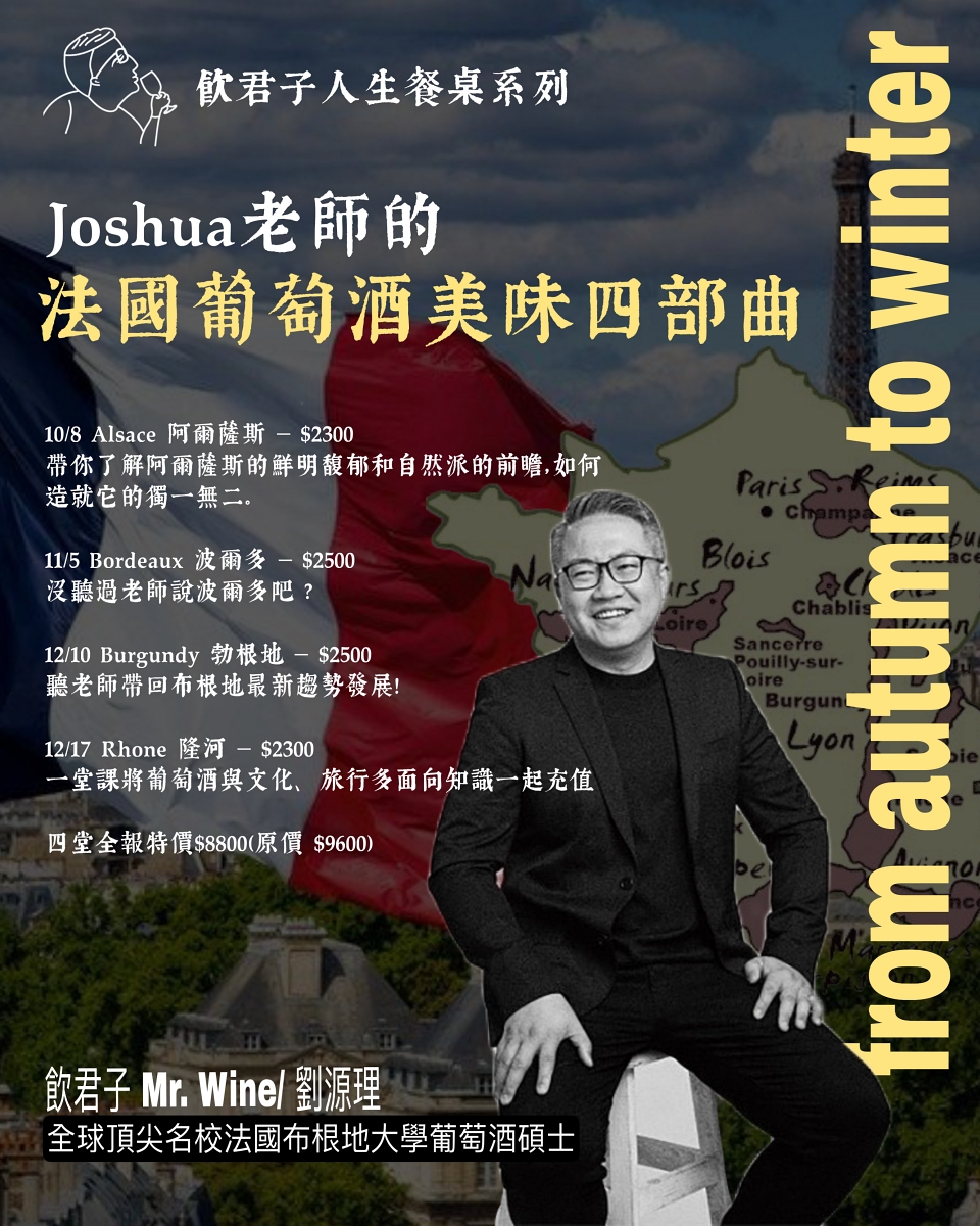 葡萄酒不只是用餐的佐飲,更是Joshua老師人生故事展開的舞台。我們用秋末冬初幾個週三的夜晚,讓懂風土、懂釀造、也懂生活品味的 Joshua劉源理老師,帶你用四場品飲,走過法國經典產區的風土,以及他和葡萄酒間的美好故事。