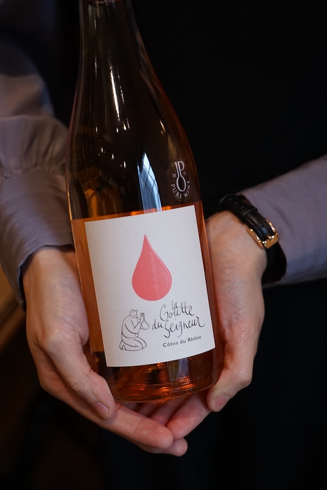 酒款以家族酒莊名做了有趣的延伸,有如甘霖般的「神之酒滴」,以當 地品種 Syrah、Cinsault 各半混釀而成,直接壓榨(direct pressing) 後以原生酵母在不銹鋼桶釀造,適合年輕享用。單飲或搭餐皆佳。從栽種到釀造全程遵循自然動力法,為展現風土的最佳入門酒款。