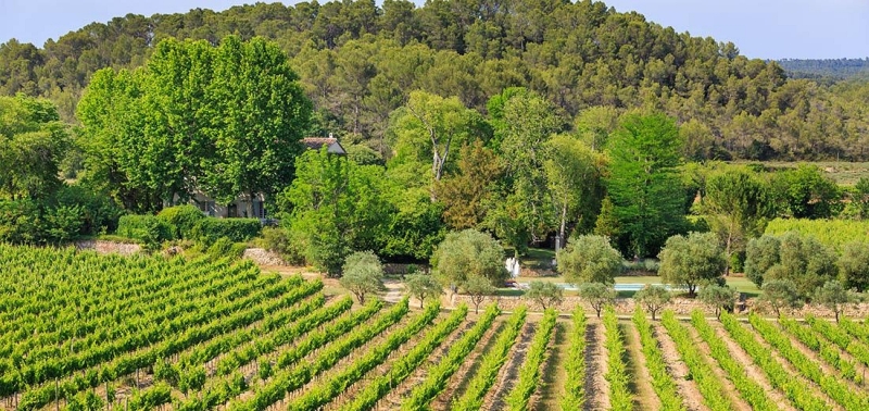 位於阿爾卑斯山麓和地中海間,坐落在一百多公頃的松樹林、橡樹林和橄欖樹林中,沿著起伏的山坡周圍種植了許多葡萄樹。