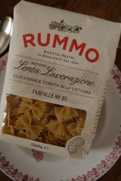 本款「蝴蝶麵 Farfalle」是以義大利當地的杜蘭小麥(Durum Wheat)製作,義大利原文因相像蝴蝶而此命名,或是也有人稱做領結麵。