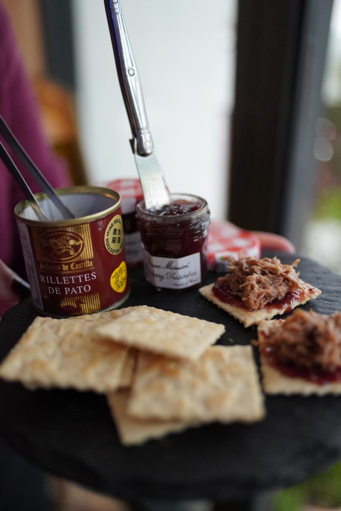 有兩種不同的抹醬,一種是滿滿的鴨肉絲咬起來有嚼感的,一種是添加白蘭地的鴨雞肝慕斯滑順口感的,買回家後用麵包或蘇打餅乾做基底,就是好吃的下酒小點心。