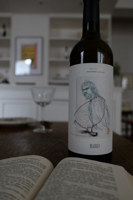 巴斯克人非常尊重自然以及他們所居住的房子,甚至幫他們的房子取名字。Marko 是 Oxer 家族房屋的名字,房子周圍被葡萄園所包圍著,正是 Marko 這種葡萄酒所用的果實來源,酒標中粗獷的原始人是莊主想像自己的樣貌,也是最原始的巴斯克人的樣子,上頭覆蓋著一隻大肥鳥,代表葡萄園中鳥非常多,天空常常會被覆鳥群蓋,酒莊得想盡辦法阻擋愛吃甜葡萄的鳥群。右下角有一個金色的石頭,代表著史前時代生活的原始器具,在這塊葡萄園中也曾經找到這樣子的古物,代表歷史與時代。